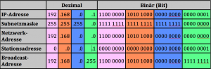 In dezimaler Schreibweise können die IP-Adressräume schnell verwirrend werden, schreibt man die IP allerdings in binäre Schreibweise um, so ergibt sich sehr schnell, wie sich die Adressräume zusammensetzen.